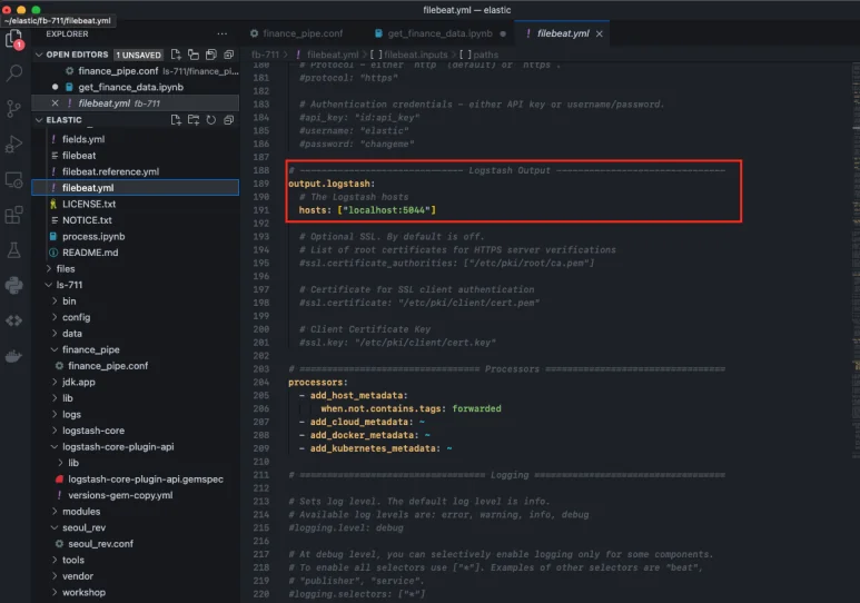 다음으로 output을 정의해 준다. beats가 데이터를 받아서 logstash로 전달해야 하므로, logstash가 실행될 로컬 port 번호를 입력해 준다.