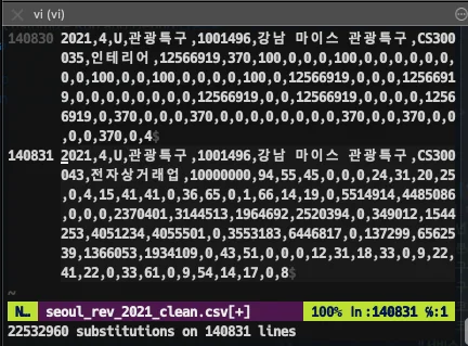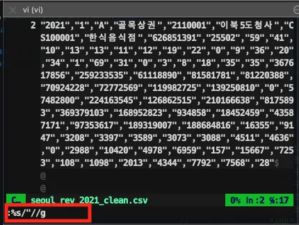 먼저, csv의 큰 따옴표 제거한다. 시스템상 특수문자마다 역슬래시 처리가 된 채로 전달되어야 텍스트를 정상적으로 읽을 수 있기 때문에 beats가 역슬래시를 포함한 텍스트를 logstash의 input값으로 전달하게 된다. 따라서 역슬래시가 포함되지 않도록 vim을 사용해 특수문자(“)를 지워준다.