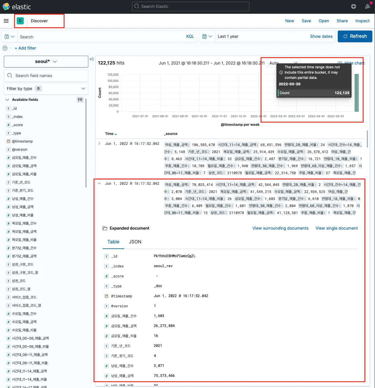 Index pattern을 정상적으로 설정했다면 Discover 탭에서 timestamp에 따라 데이터가 쌓이는 모습을 볼 수 있다. 지금은 데이터가 약 12만 건이고, 5월 30일 기준으로 한 번에 넣었기 때문에 이렇게 데이터가 몰려있다.