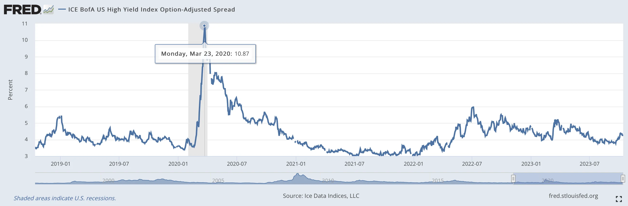 2020년 3월 23일 하이일드 채권 스프레드 10.87%로 절정. 시장의 극단적인 위험 기피