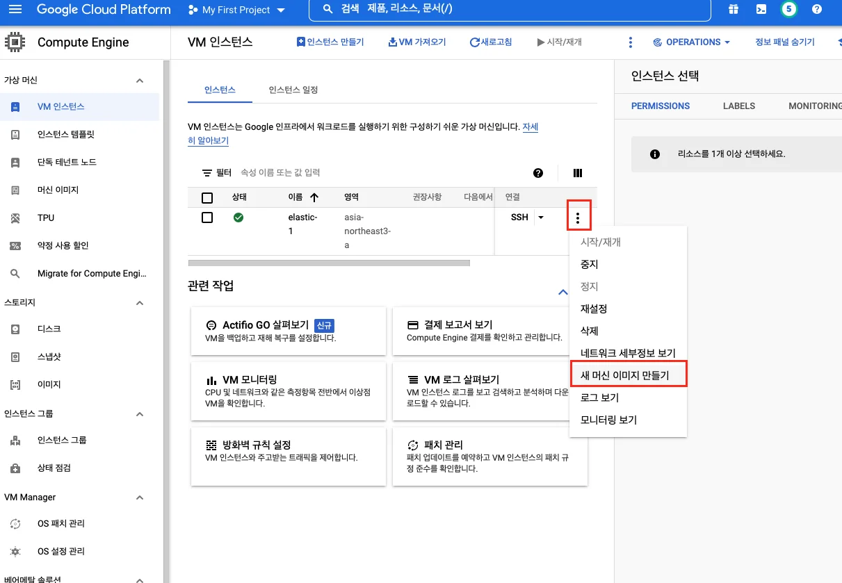 **VM 인스턴스 탭 ->**이미지 생성 -> 생성된 이미지로 새로운 인스턴스 생성**