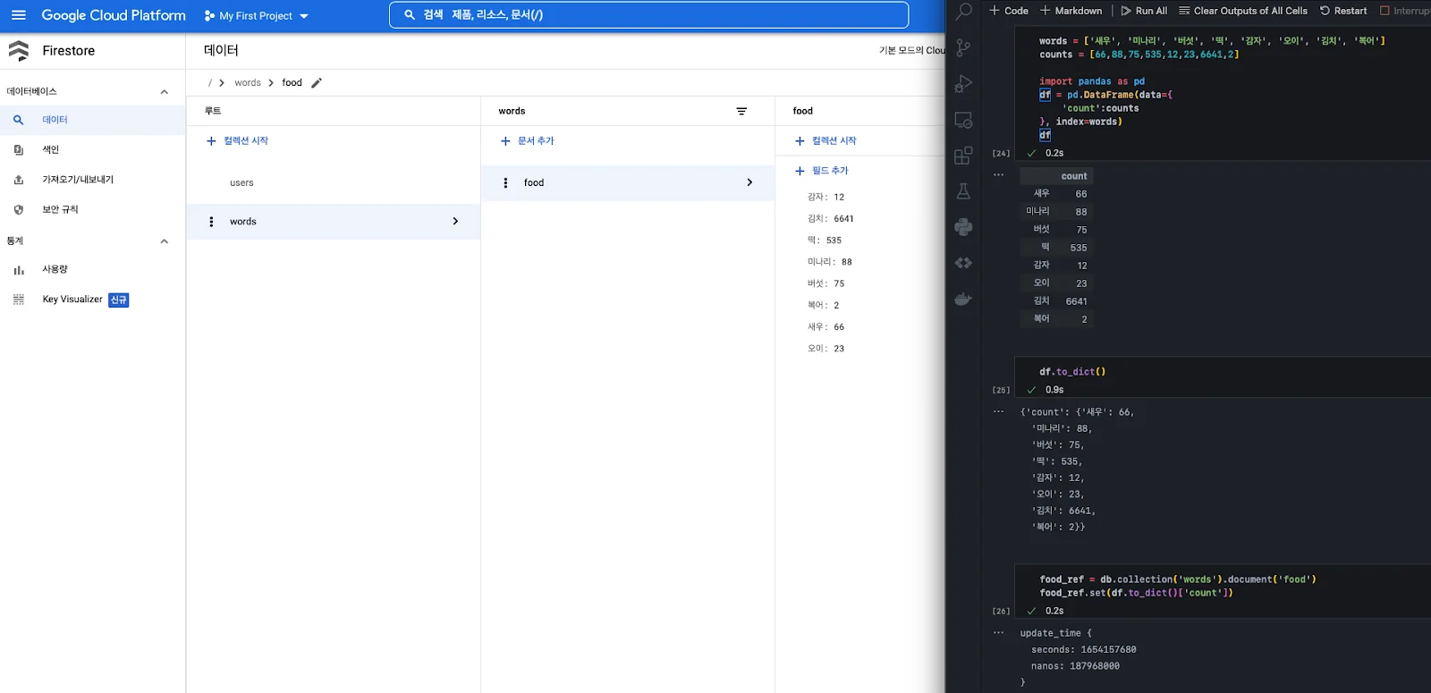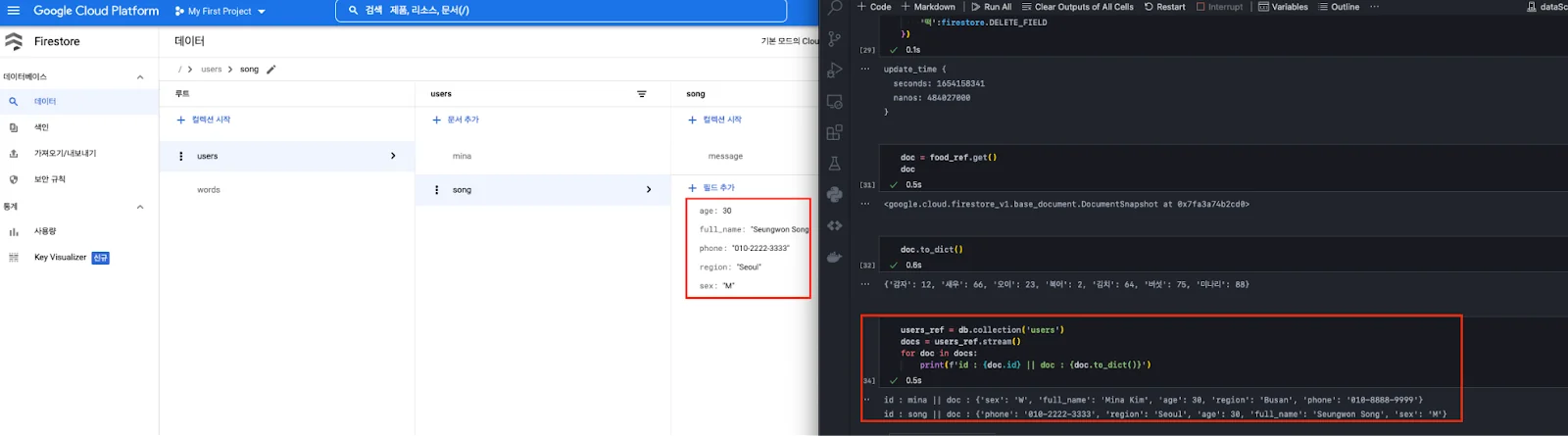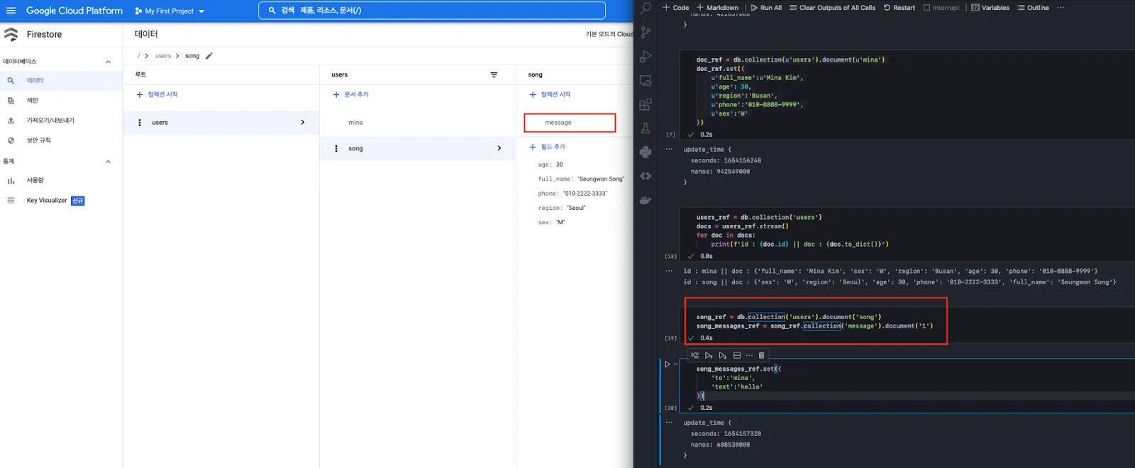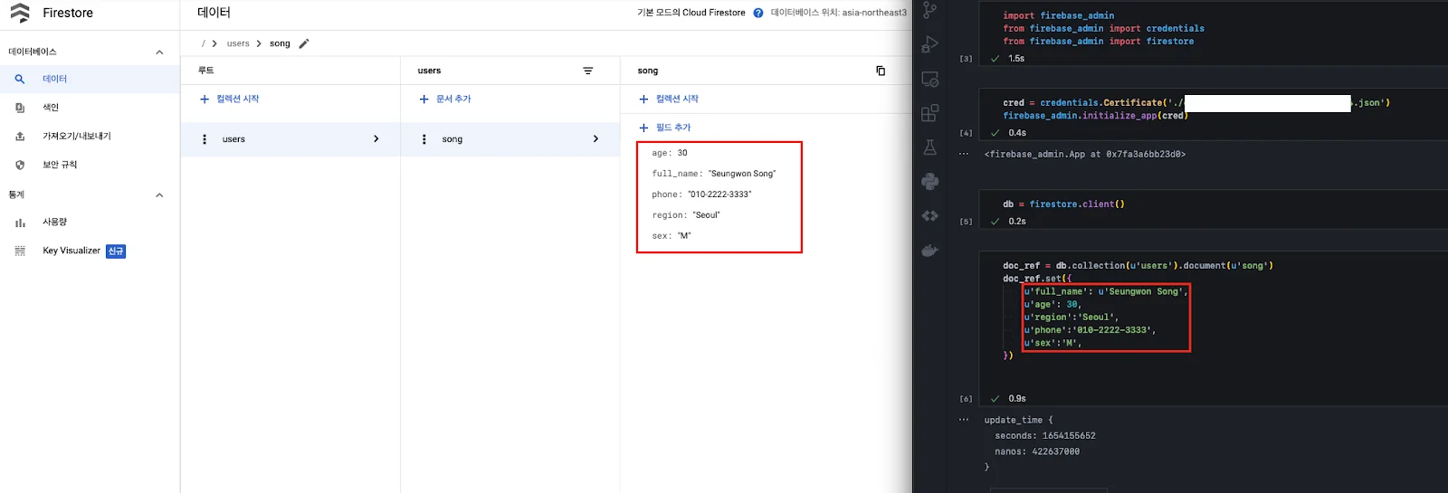 설정(키 인식)이 끝났다면, 데이터를 넣어본다. 만약 doc_ref 변수로 지정한 collection과 document가 없다면 알아서 생성된다.