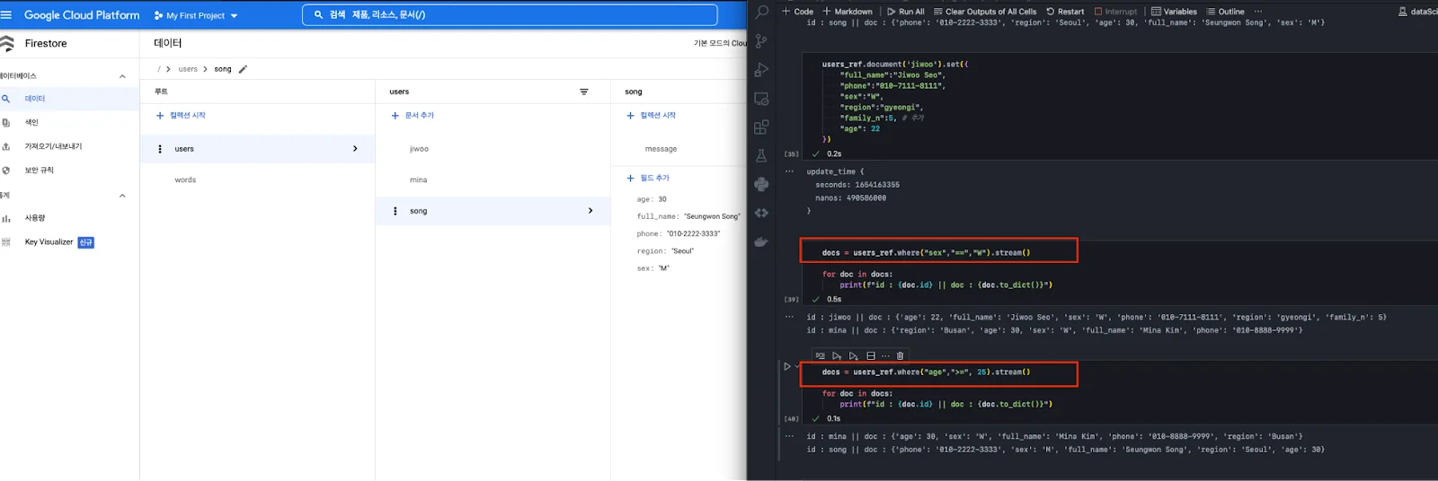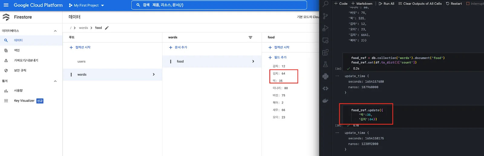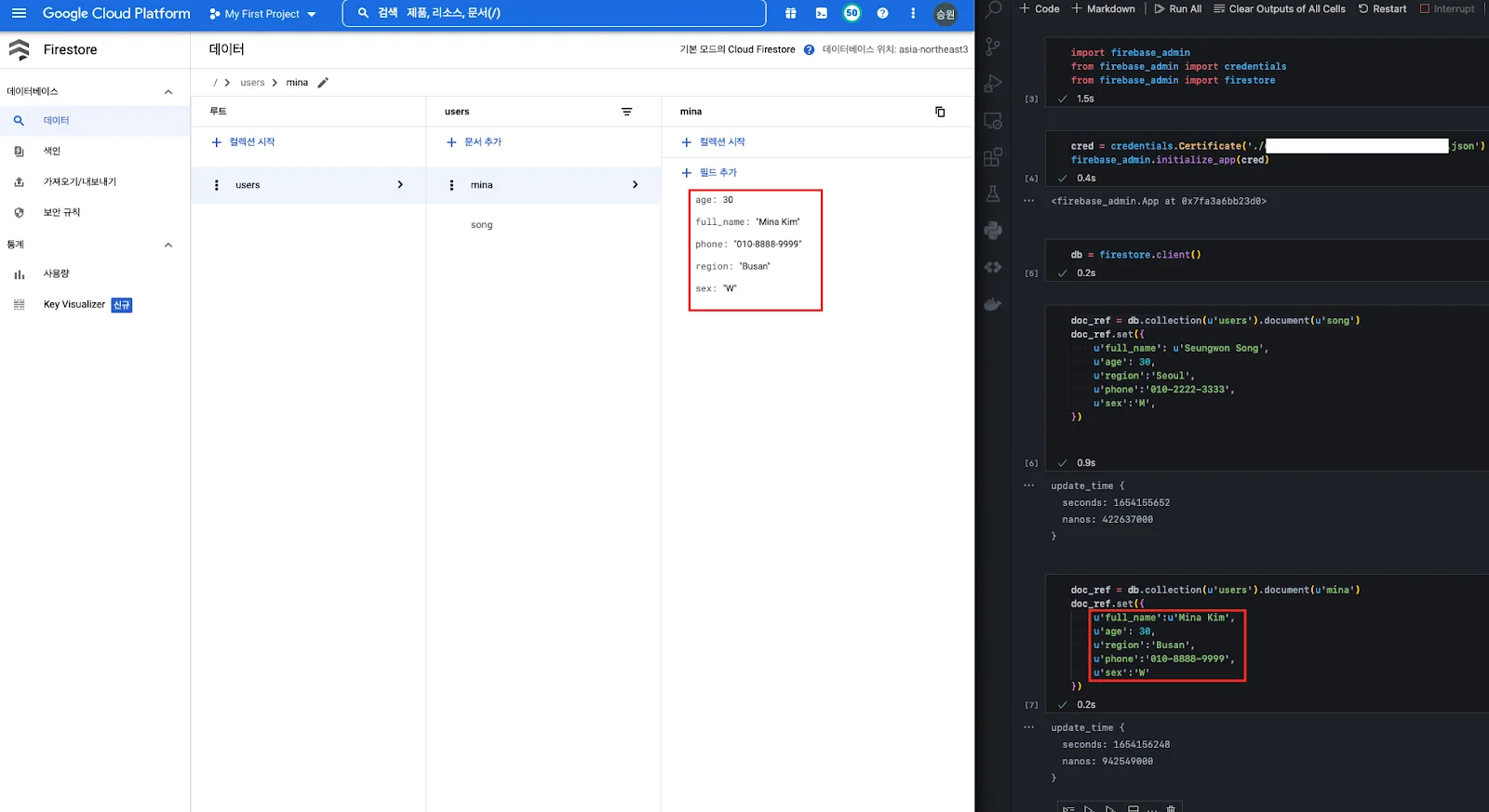 설정(키 인식)이 끝났다면, 데이터를 넣어본다. 만약 doc_ref 변수로 지정한 collection과 document가 없다면 알아서 생성된다.