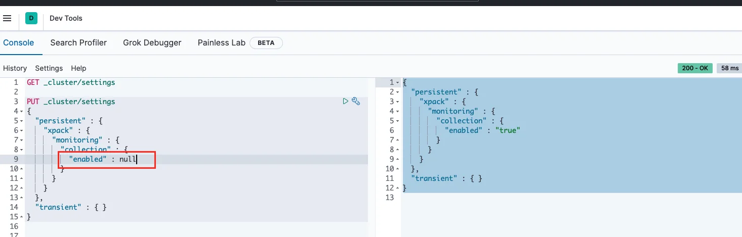 메모리 용량 조절을 위해 모니터링하지 않을때는 데이터가 쌓이지 않도록 Dev-Tools 탭에서 elastic search 명령으로 초기화할 수 있다.
