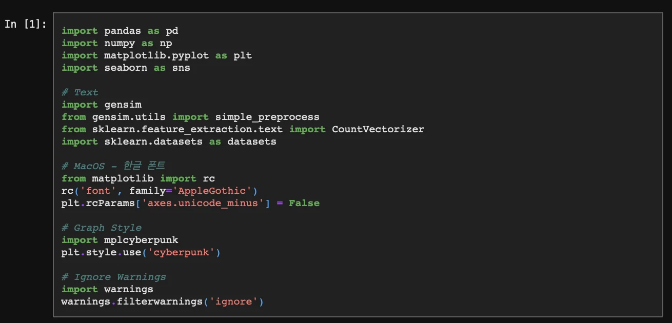 우리는 이러한 컨셉의 프로세스에 따라 1.문서를 단어 조합으로 가공하고, 2~5.문서 내 각 단어들의 의미를 부여한 다음, 6.문서의 토픽을 결정해보도록 하자.