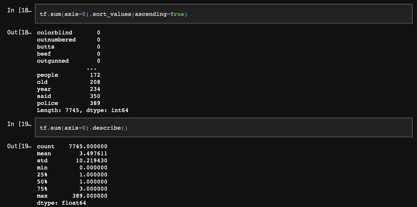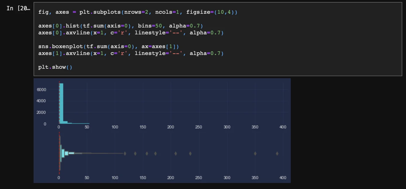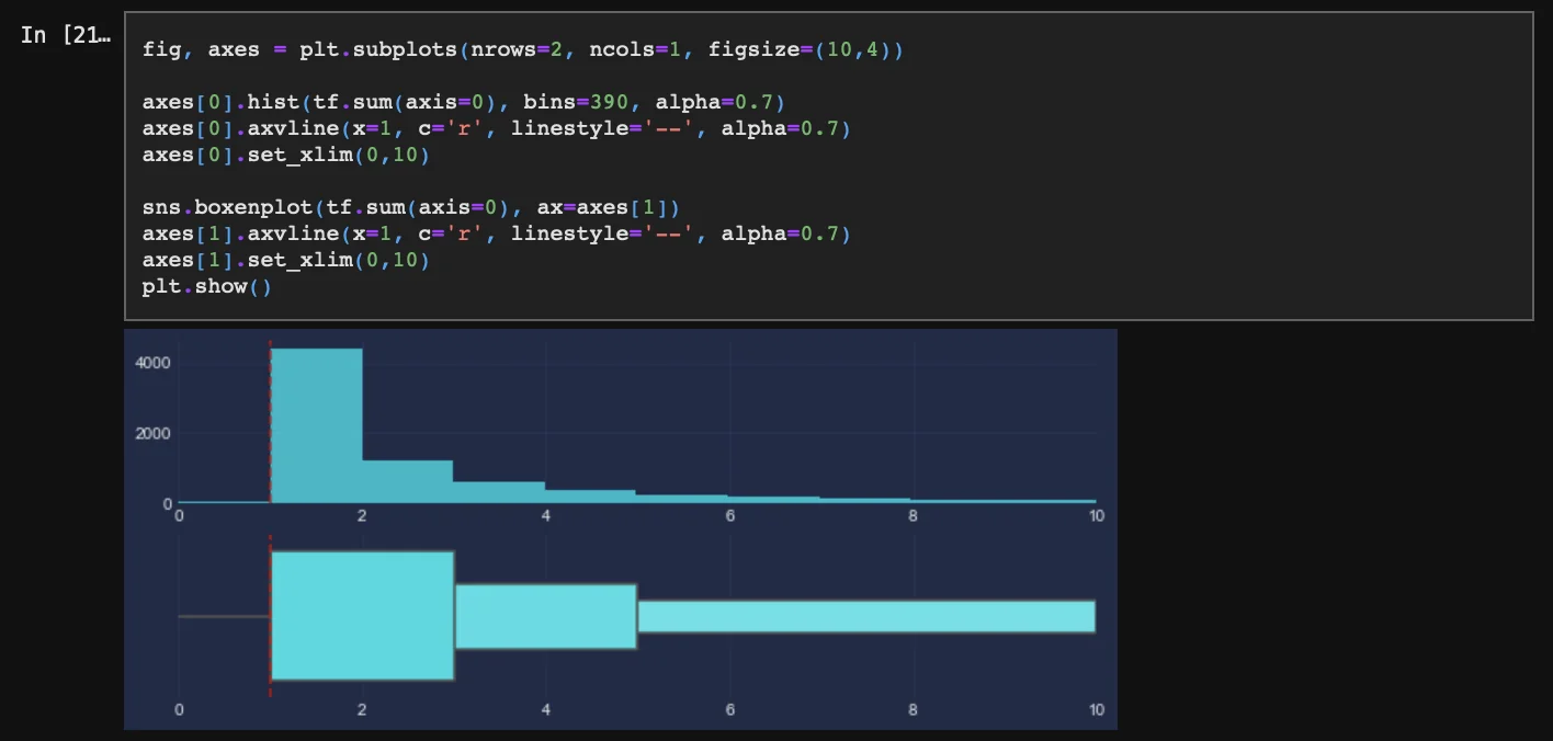 - 바로 위 셀에서 처럼 특정 단어를 포함하는 문서의 수가 총 문서의 수 대비 매우 적을 수 있다. 따라서 로그를 취해 분포가 너무 커지지 않도록 스케일을 줄여준다.