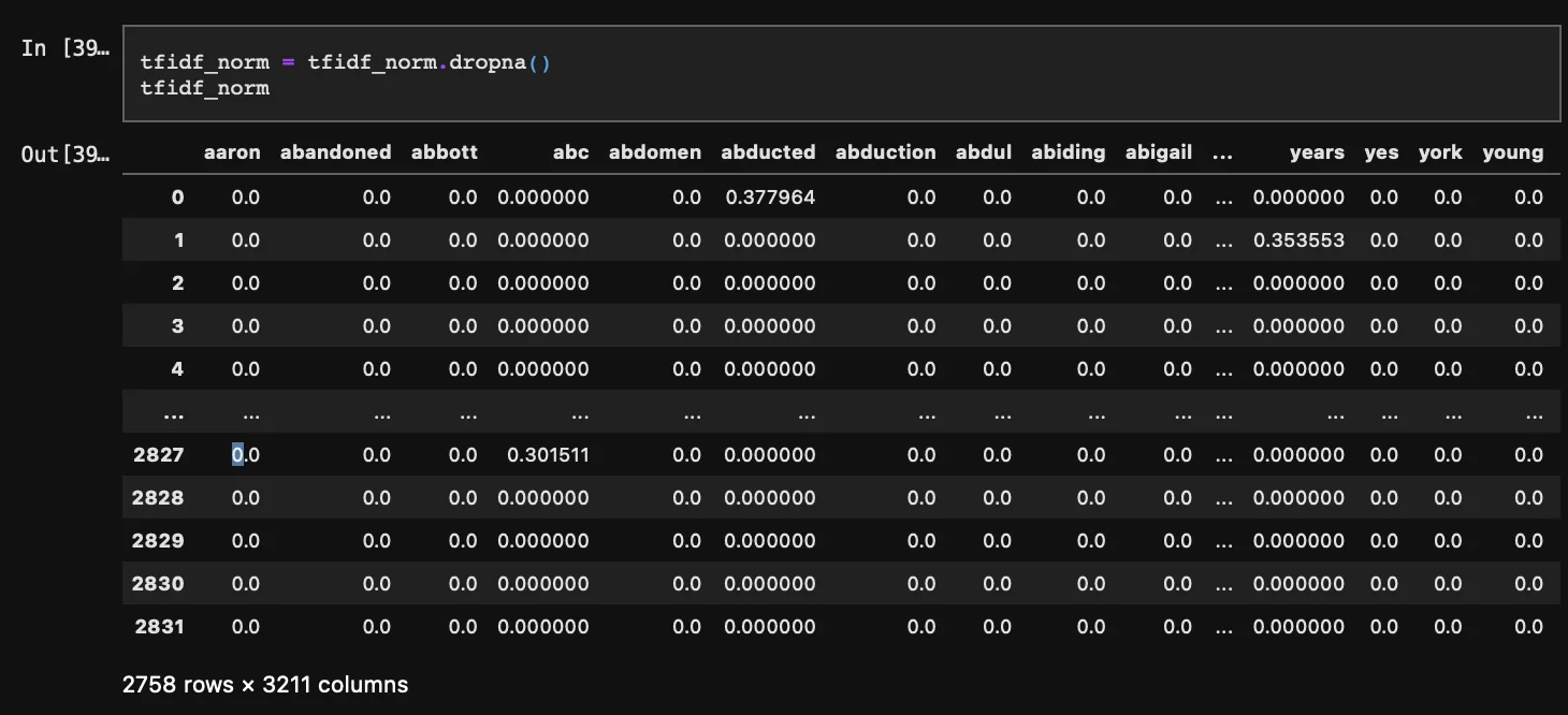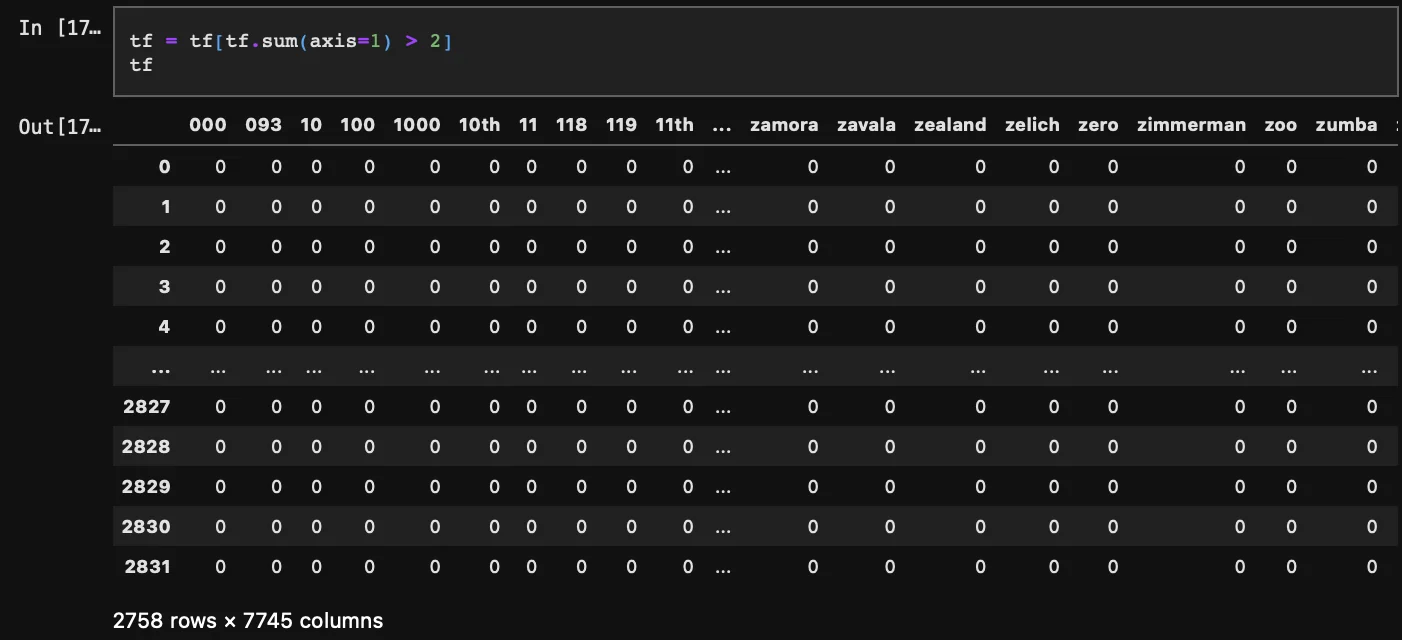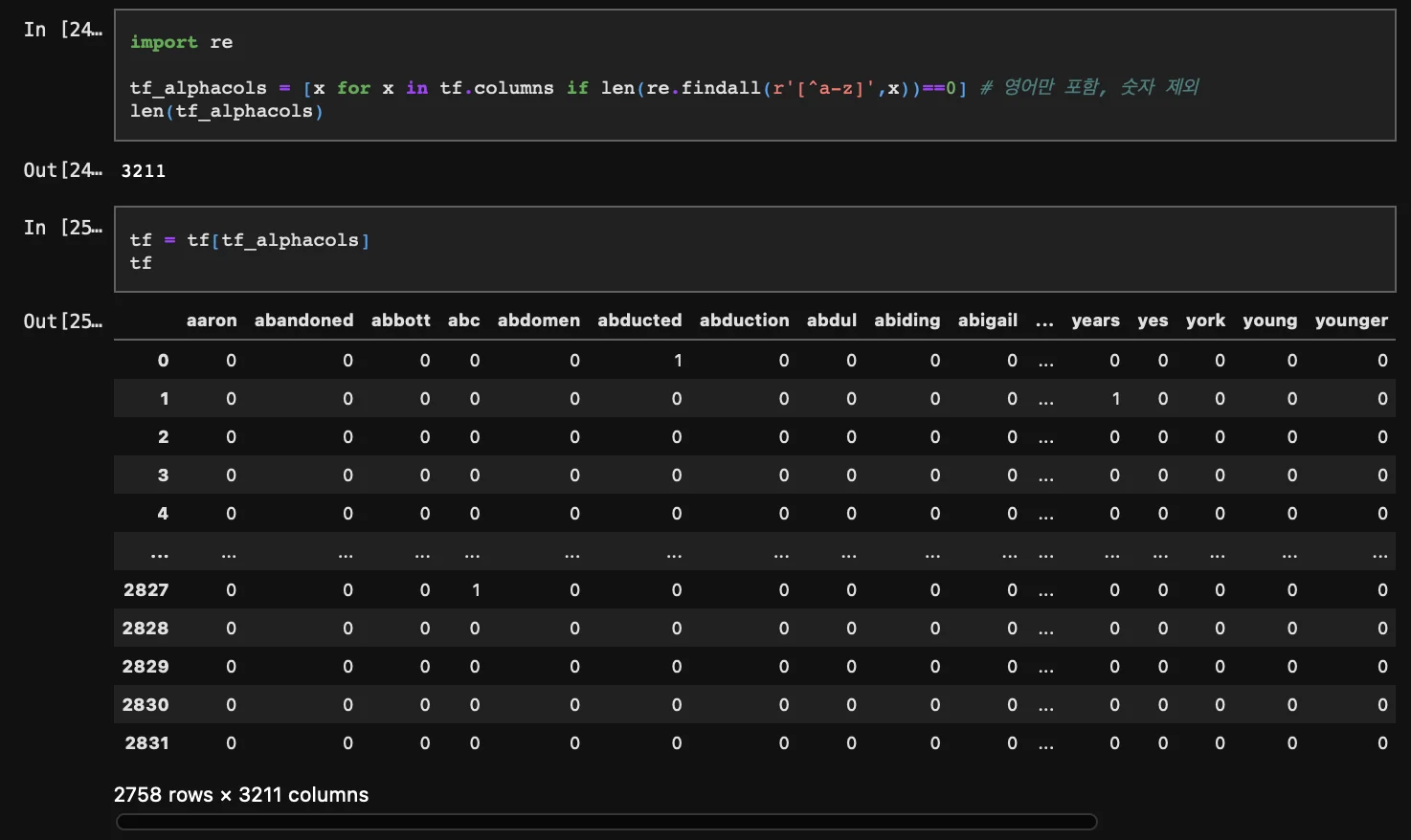 이렇게 TF-IDF 중 TF(문서별 단어 빈도) 구성을 완료했다.