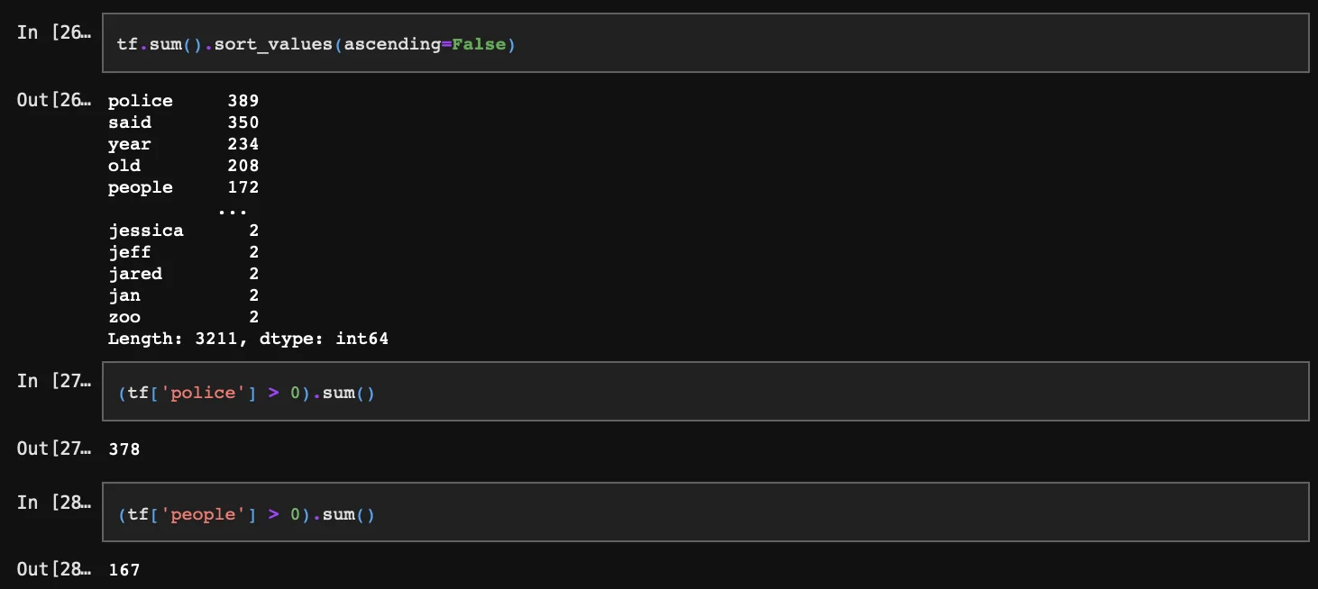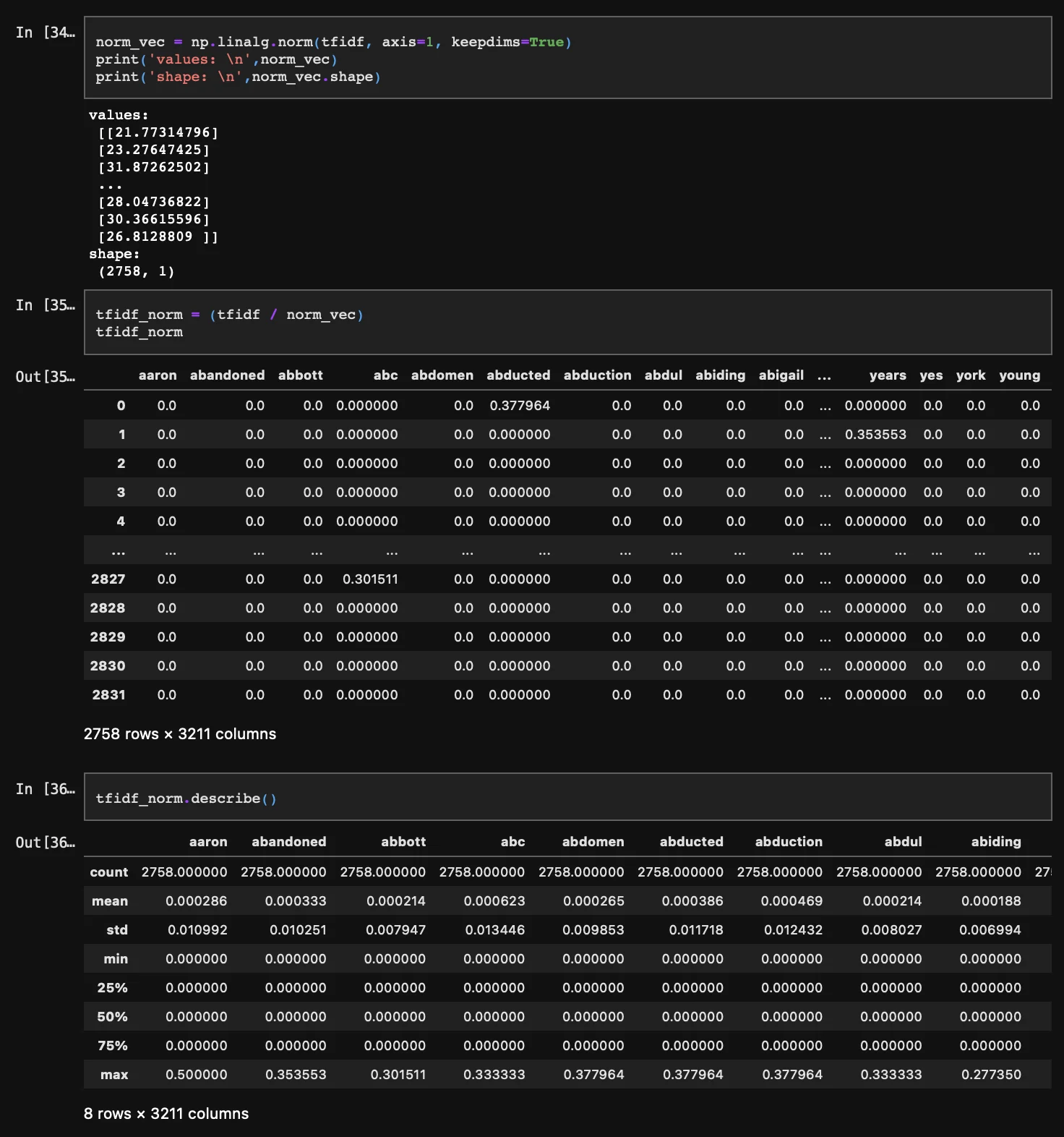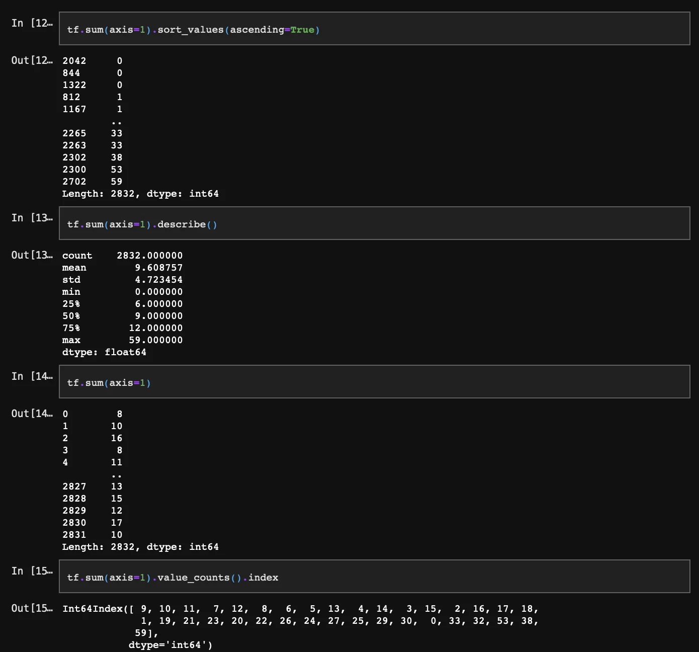 이렇게 TF-IDF 중 TF(문서별 단어 빈도) 구성을 완료했다.
