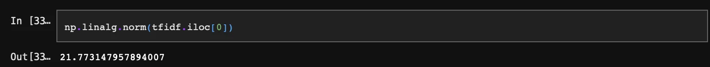따라서 각 단어의 고유속성, 즉 단어 벡터크기(원점으로부터의 길이)를 나눠주자. 예를 들어 첫 번째 단어의 경우 벡터크기는 다음과 같다.
