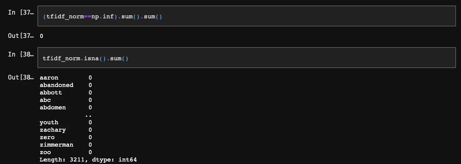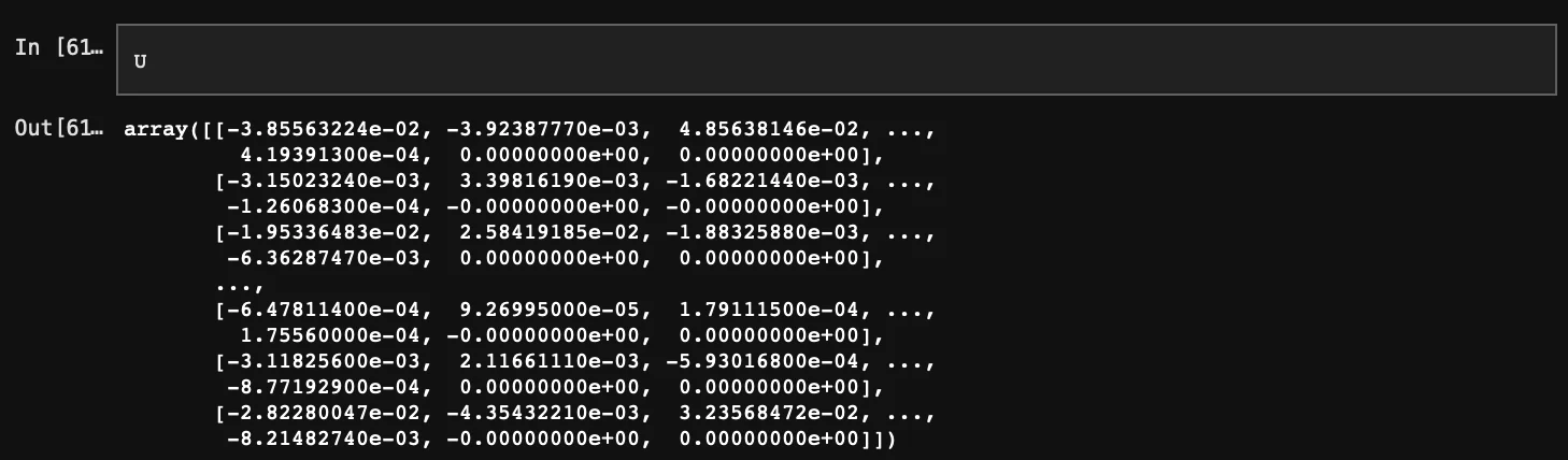 먼저, SVD를 수행하기 전에 np.inf(무한대), 혹은 np.nan(계산불가) 값이 있는지 확인해야 한다. 넘파이 연산 시 실수를 0으로 나누면 inf 값을, 0을 0으로 나누면 NaN값을 반환하게 되는데, 앞서 충분히 많은 0의 극한값들을 서로 연산했기 때문에 문제 가능성이 있다.