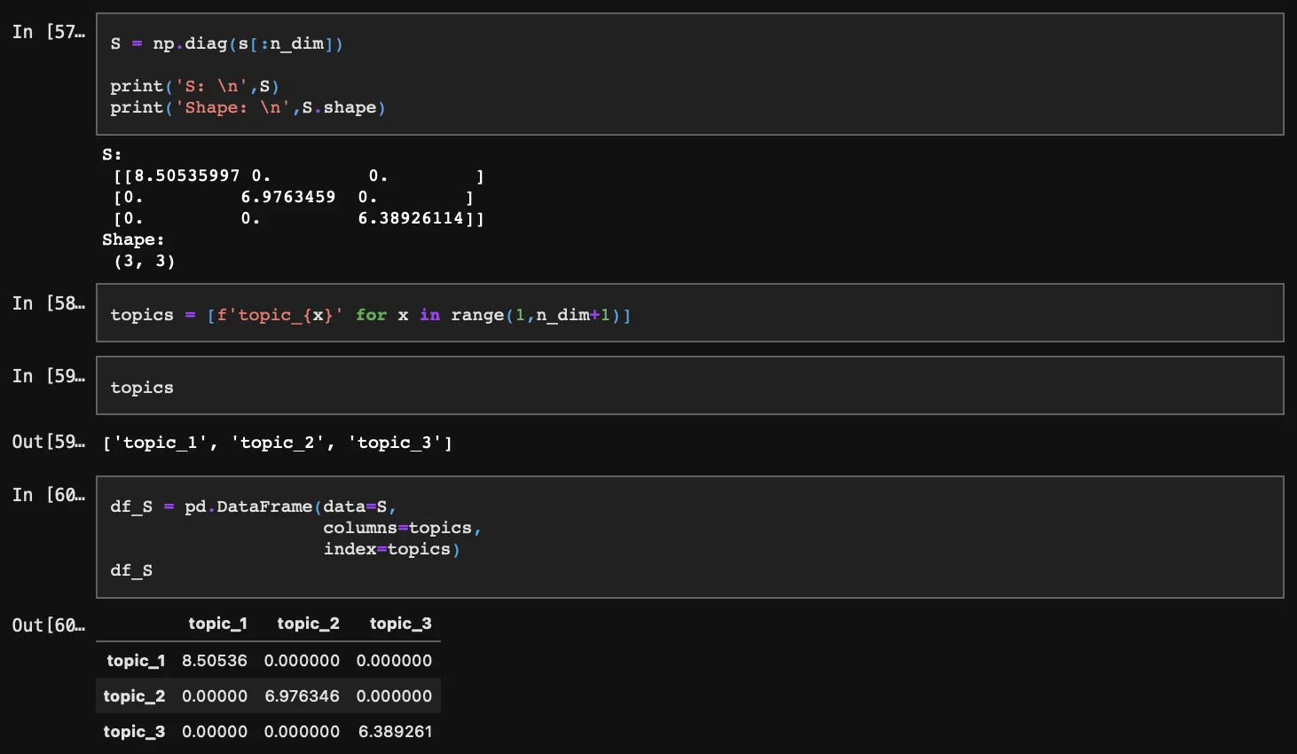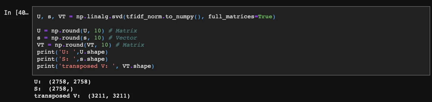LSA는 SVD 행렬분해(특이값 분해)를 통해 추출한 대각행렬(특이값 행렬)에서 정보량이 많은(값이 큰) 부분을 추출해 최소한의 차원(벡터)으로 토픽을 구성하는 방법론이다. 따라서 SVD를 1차 수행한 후 정보량이 많은 부분행렬을 추출하는 방식으로 LSA를 구현해보도록 하자.