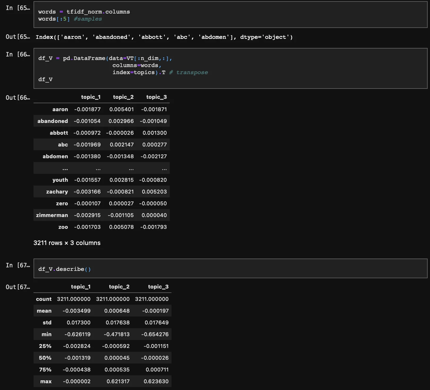 마지막으로 V는 각 단어가 각각의 토픽마다 일치하는 확률을 담고 있다. VT를 특이값 s의 크기 3에 맞춰 행을 잘라주면 가장 설명력(정보량)이 높은 3개 토픽에 대한 확률만 추출되고 이를 Transpose 시키면 V를 구할 수 있다.