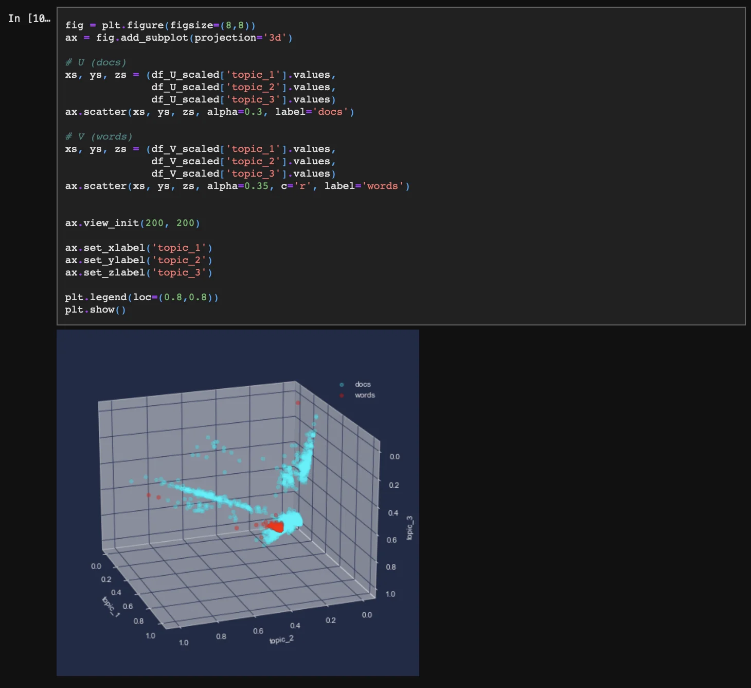 Step 1로 돌아가서, 문서는 단어의 조합이라 했다. 각 단어는 동시 출현 빈도에 따라 연관성을 가지며 이러한 연관성이 결과적으로 토픽을 결정한다. 이렇게 결정된 토픽에 단어 조합으로 구성된 각 문서가 일치할 확률을 표현한다. 따라서 U와 V는 모두 토픽에 일치할 확률을 보여주지만 개념적으로 단어가 토픽의 정보량을 결정하고 그렇게 결정된 정보로 문서를 설명하기 때문에 words 대비 docs는 분포가 펼쳐질 수밖에 없다는 것이다.