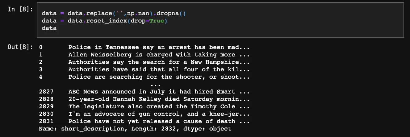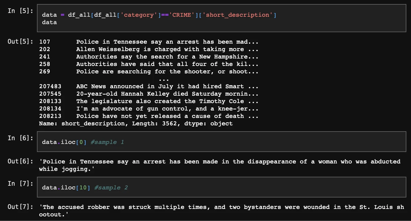 우리는 이렇게 이미 잘 나눠진 카테고리를 다시 한번 토픽모델링을 통해 세부 카테고리로 나눠볼 것이다. 분석하고자 하는 뉴스 카테고리를 하나 선정한 다음 요약 내용을 담고 있는 short_description 부분만 추출한다.