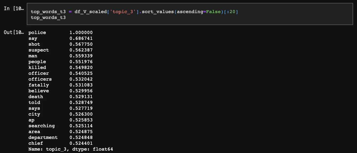 마지막으로 topic_3의 경우 police, officer, say 등이 상단에 위치한 것으로 보아 경찰의 행동이나 발언에 초점을 맞추고 있음을 알 수 있다.