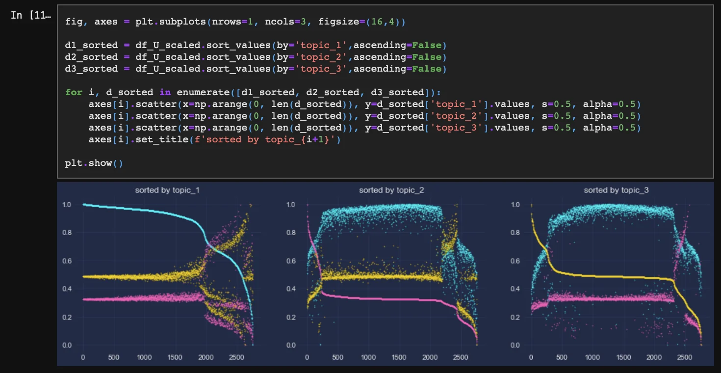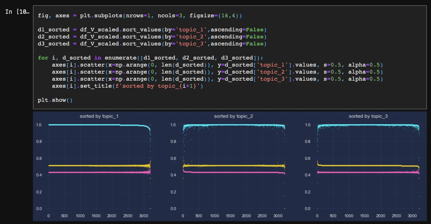 토픽별로 각각의 문서가 속할 확률을 보여주고 있으며 왼쪽부터 순서대로 topic_1, topic_2, topic_3을 기준으로 확률분포를 정렬시켰다.