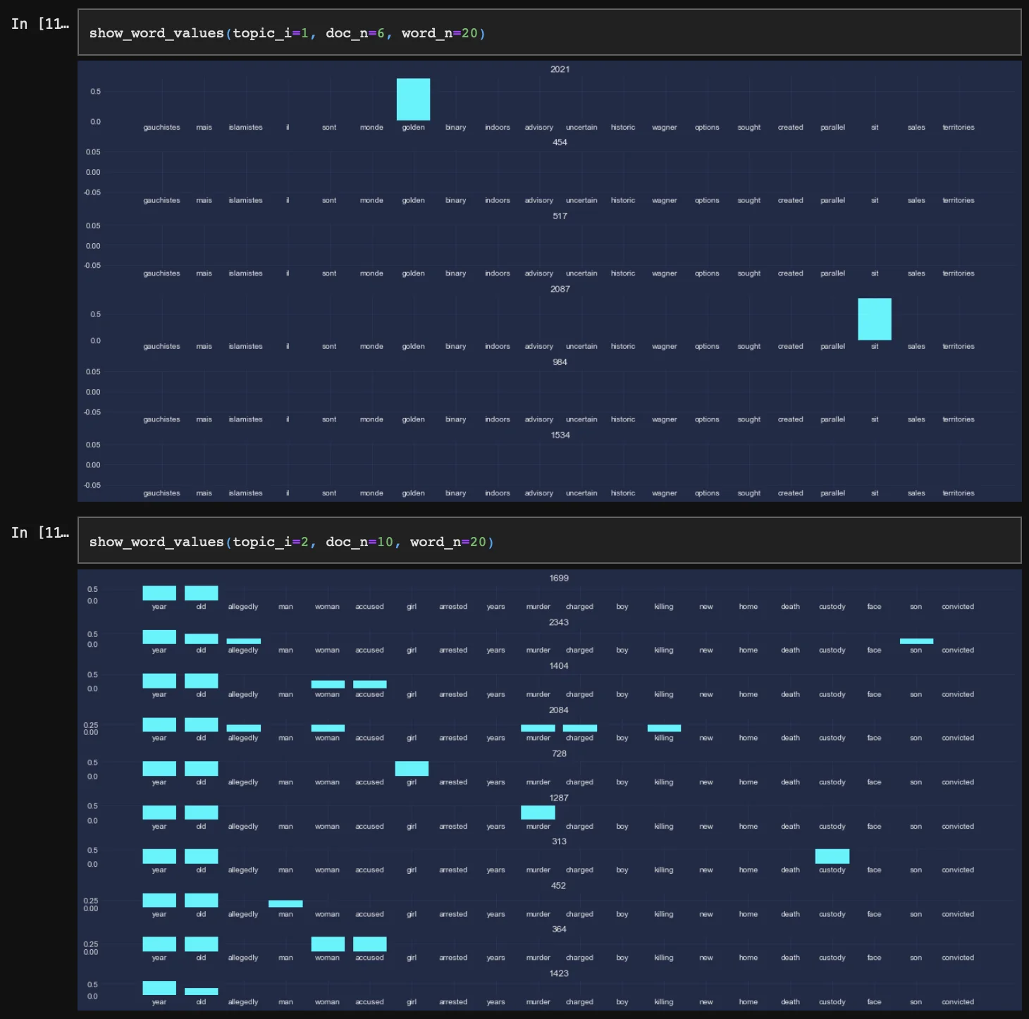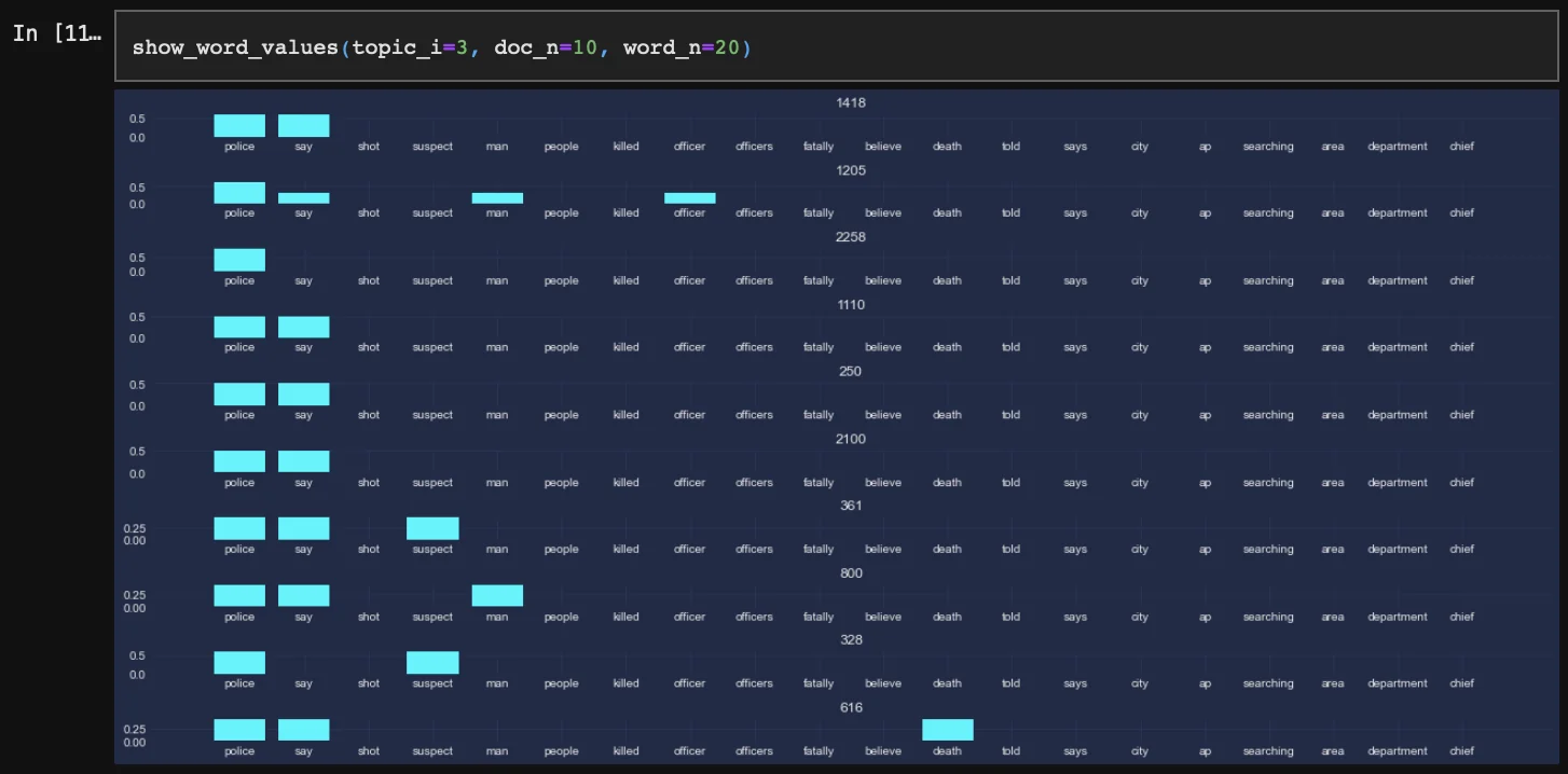 마지막으로 각 토픽별로 일치 확률이 가장 높은 문서들에 어떤 단어들이 포함되어 있는지 확인해 본다. 이때, 단어 역시 각 토픽별 가장 높은 확률을 가진 단어들로 구성하여 동일한 단어들이 문서별로 또 어떻게 다르게 분포되어 있는가를 확인하고자 한다.