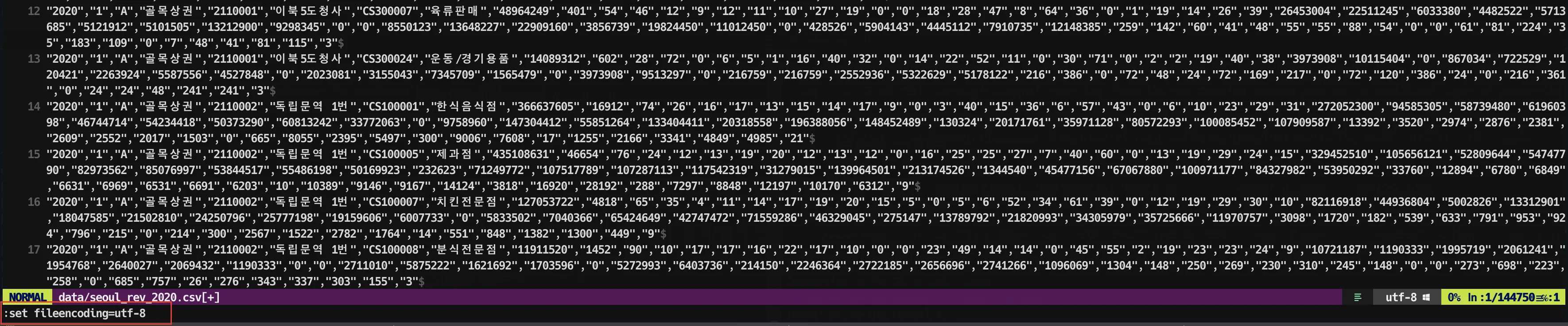 이렇게 인코딩 정보가 다르면 한글을 정상적으로 읽을 수 없기 때문에 vim으로 파일을 열어서 인코딩 형식을 변경해준다.